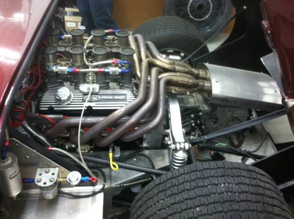 It's a 392 Ford small-block stroker with Webers attached to a 5-speed Pantera transaxle.